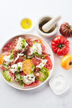 1. Snijd de tomaten in plakjes en marineer ze in olijfolie, peper en zout. Verdeel ze over een groot bord of een schaal. Verdeel de burrata over de tomaten.