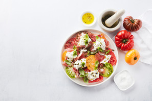 Carpaccio de tomates au jambon de parme, burrata, huile de truffe et pistache