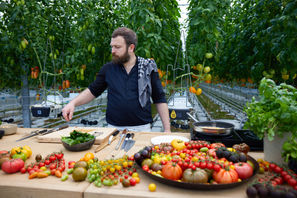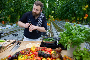 11. Presenteer met de 2 overgebleven Miss Perfect Délice tomaatjes en 2 overgebleven Yoom Délice tomaten, ieder in 2 of 4 delen gesneden.